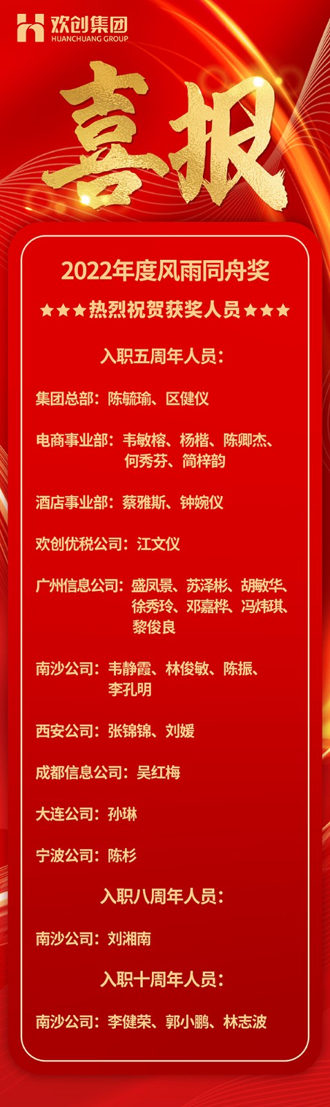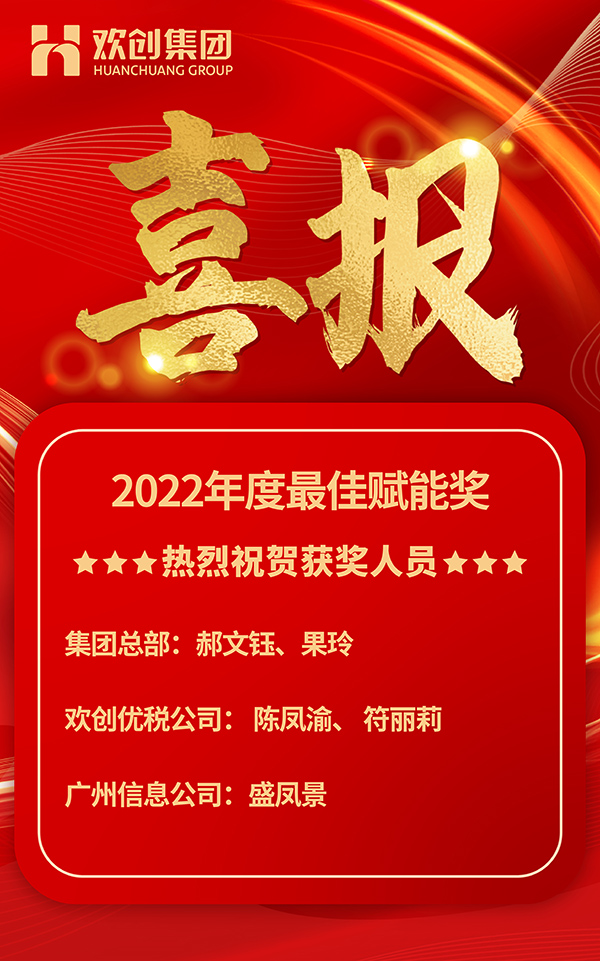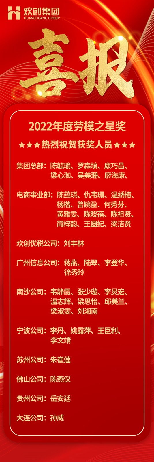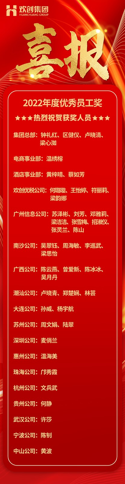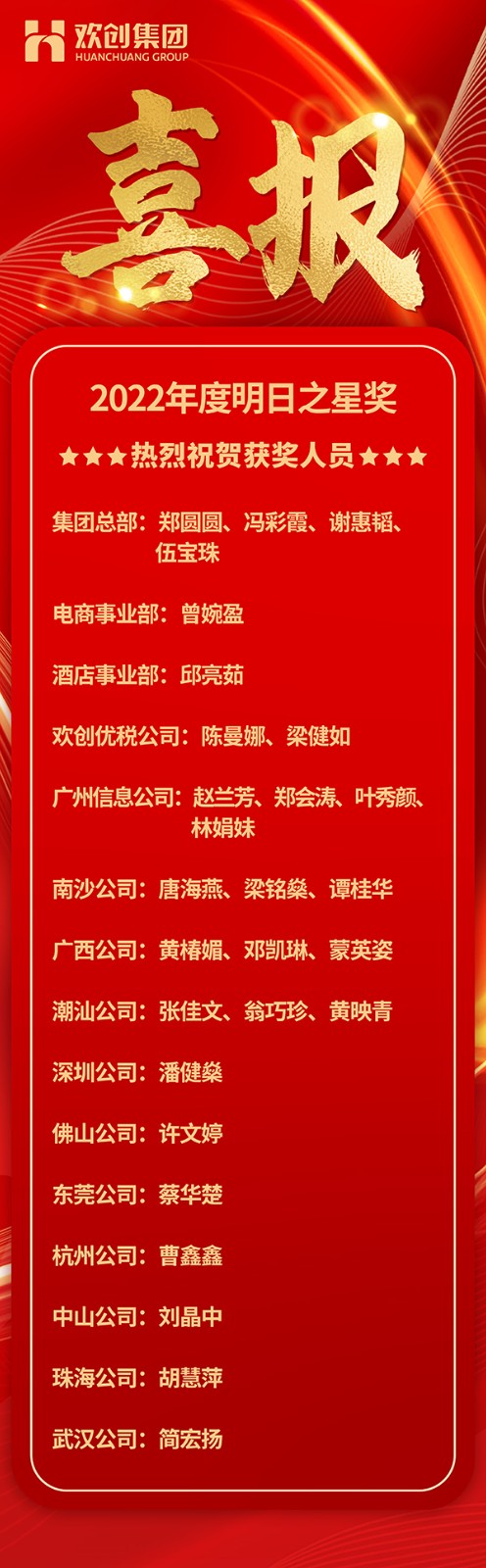 根据欢创集团公告的2022年度评优方案,经过各单位的推荐及集团的评审,2022年度欢创集团员工个人类奖项评优结果出来啦!现将获奖情况公告如下: