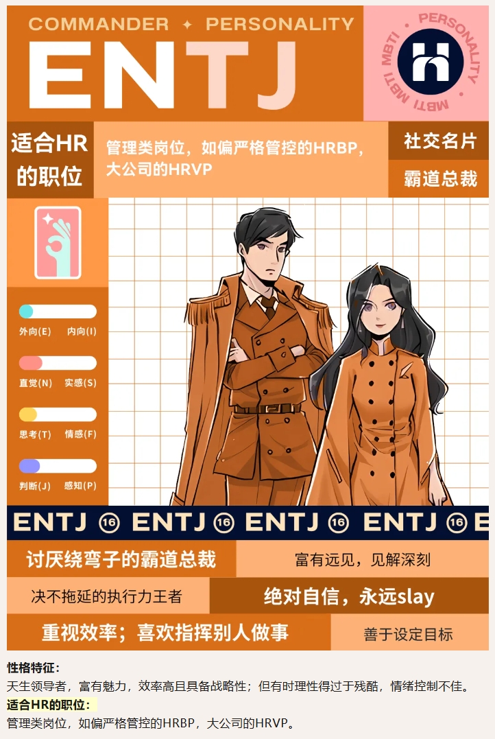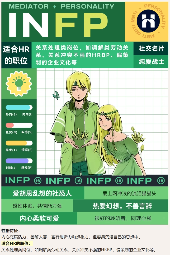 关注公众号【欢创人力集团】,在消息框发送关键词【职业测试】即可免费测试你的MBTI,滑动文章在以下16个类型对号入座,了解适合自己的人力资源岗位~。